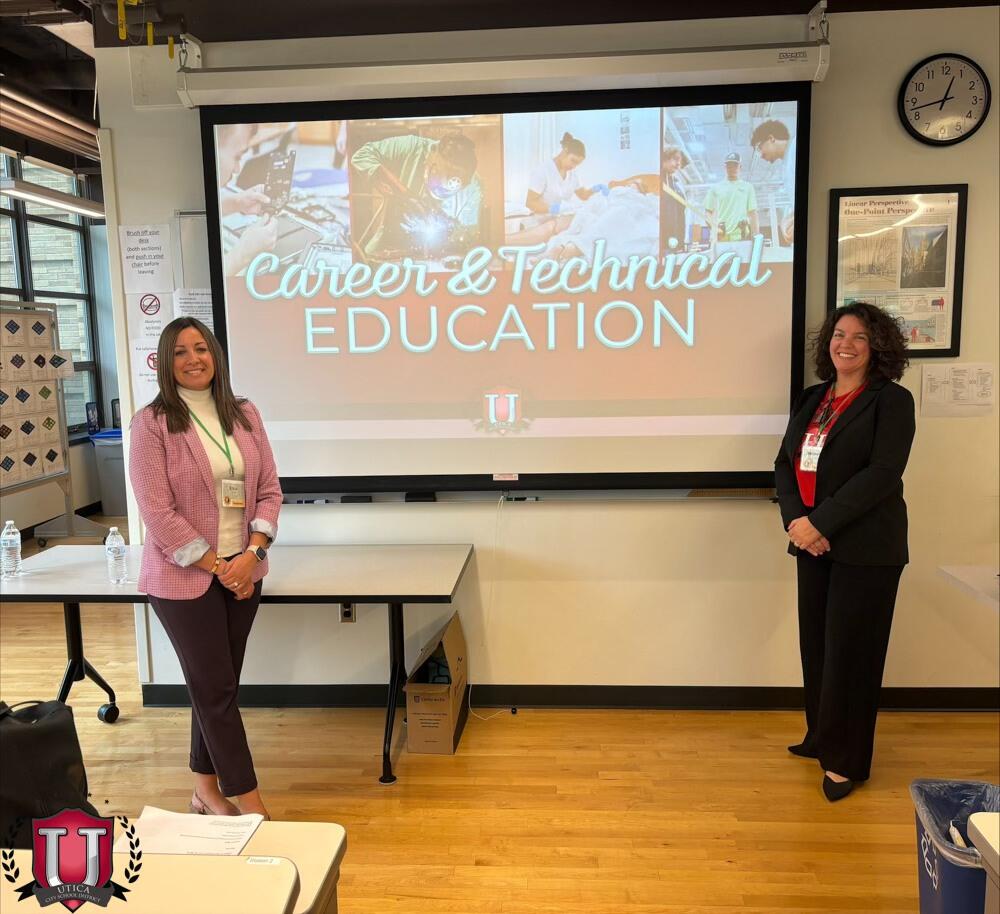 Erica Schoff នាយកផ្នែកអប់រំ អាជីព និងបច្ចេកទេស និង Michelle Hall អ្នកគ្រប់គ្រងកម្មវិធីសិក្សា និងការសិក្សា តំណាងឱ្យ Utica City School District ជាអ្នកធ្វើបទបង្ហាញសម្រាប់នាយកដ្ឋានបច្ចេកវិទ្យានៅសាកលវិទ្យាល័យរដ្ឋញូវយ៉កនៅឯសន្និសិទរដូវស្លឹកឈើជ្រុះបច្ចេកវិទ្យាលើកទី 85 របស់ Oswego ។