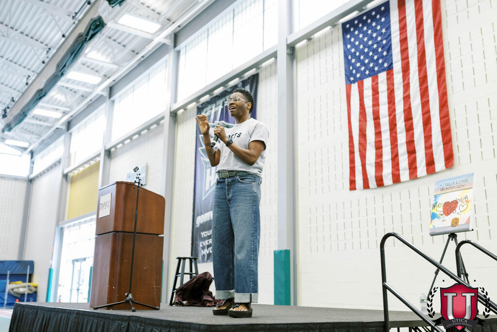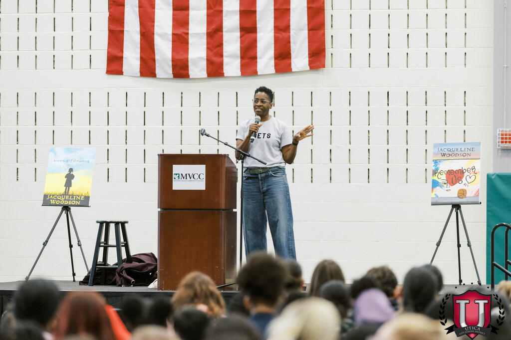 សិស្សមានឱកាសស្តាប់អ្នកនិពន្ធ Jacqueline Woodson ចែករំលែកអំពីអាជីពរបស់នាង ហើយសួរសំណួរ! Jacqueline Woodson គឺជាអ្នកនិពន្ធច្នៃប្រឌិតនៃអក្សរសិល្ប៍កុមារ និងយុវវ័យ ហើយបានបោះពុម្ពសៀវភៅចំនួន 43 ក្បាល។ ស្នាដៃរបស់នាងលើកទឹកចិត្តសិស្សឱ្យក្លាយជាអ្នកនិពន្ធកាន់តែប្រសើរ និងគាំទ្រការអប់រំតួអក្សរ។ សិស្សមកពីសាលាបឋមសិក្សា General Herkimer បានបង្កើតគម្របសៀវភៅចម្លងសម្រាប់ព្រឹត្តិការណ៍ដែលត្រូវបានបង្ហាញដោយមោទនភាពនៅលើឆាកដូចដែល Jacqueline បាននិយាយ។